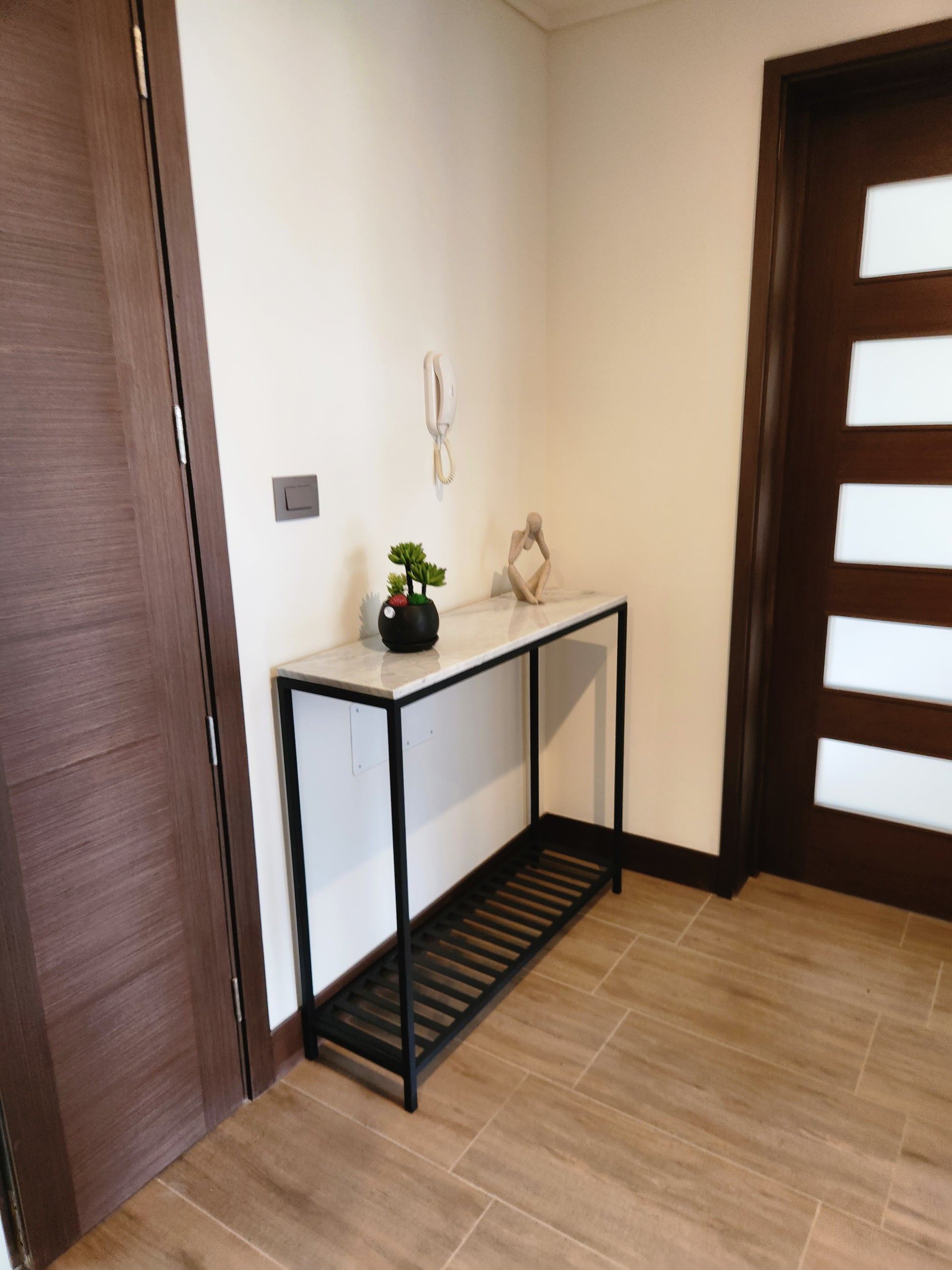 Un arrimo elegante y funcional que realza cualquier espacio. La cubierta de mármol Carrara aporta un look premium y atemporal, mientras que la repisa inferior añade practicidad para decorar o almacenar.