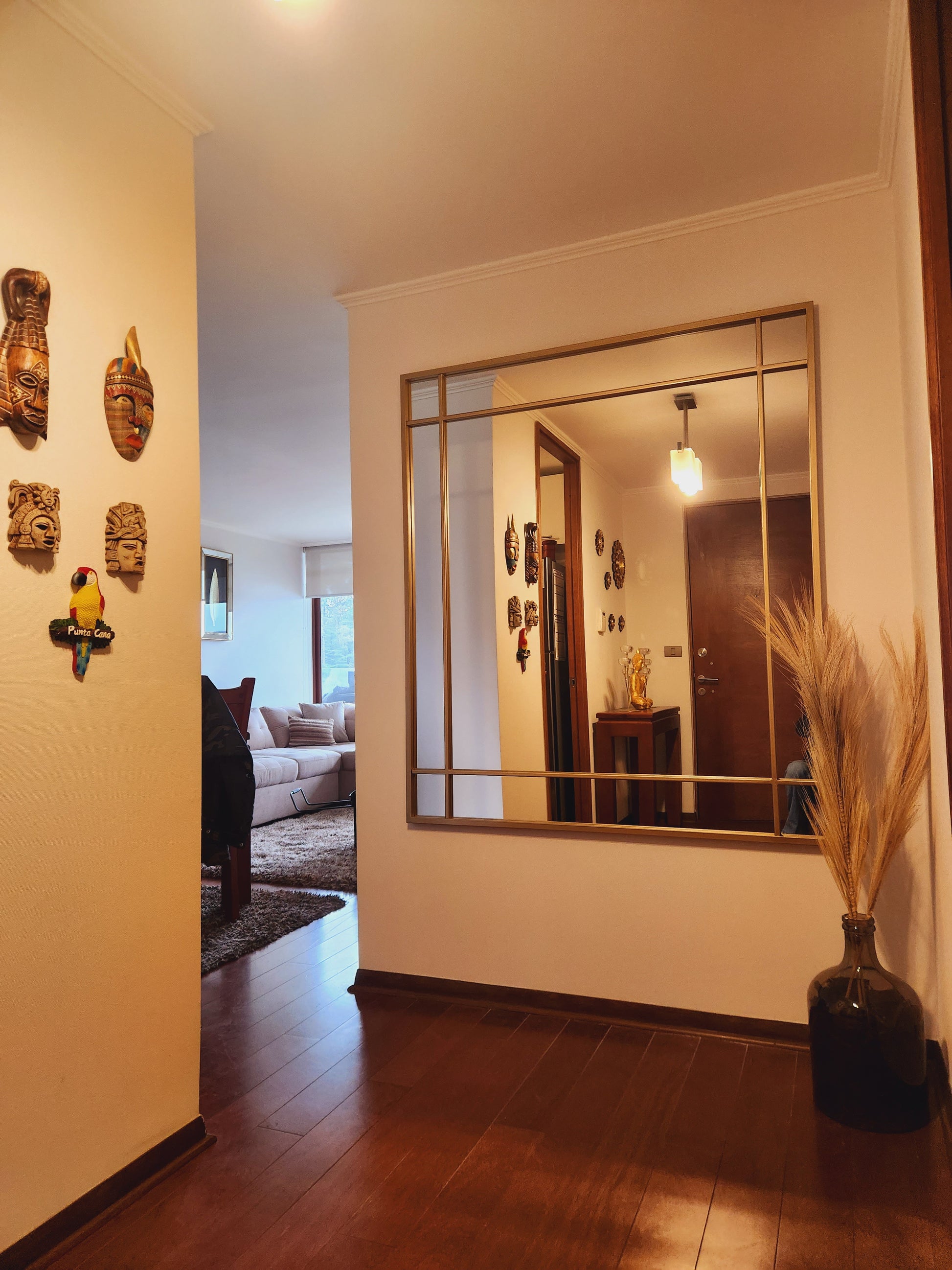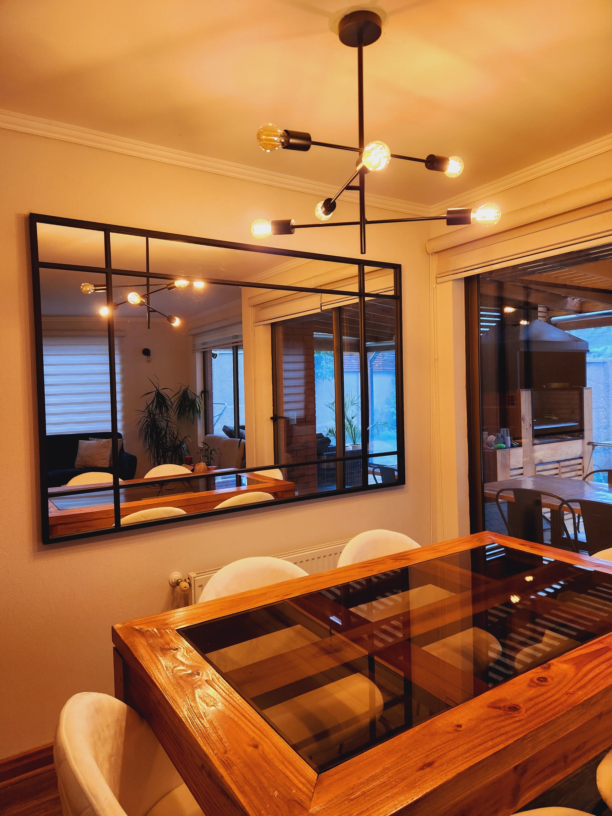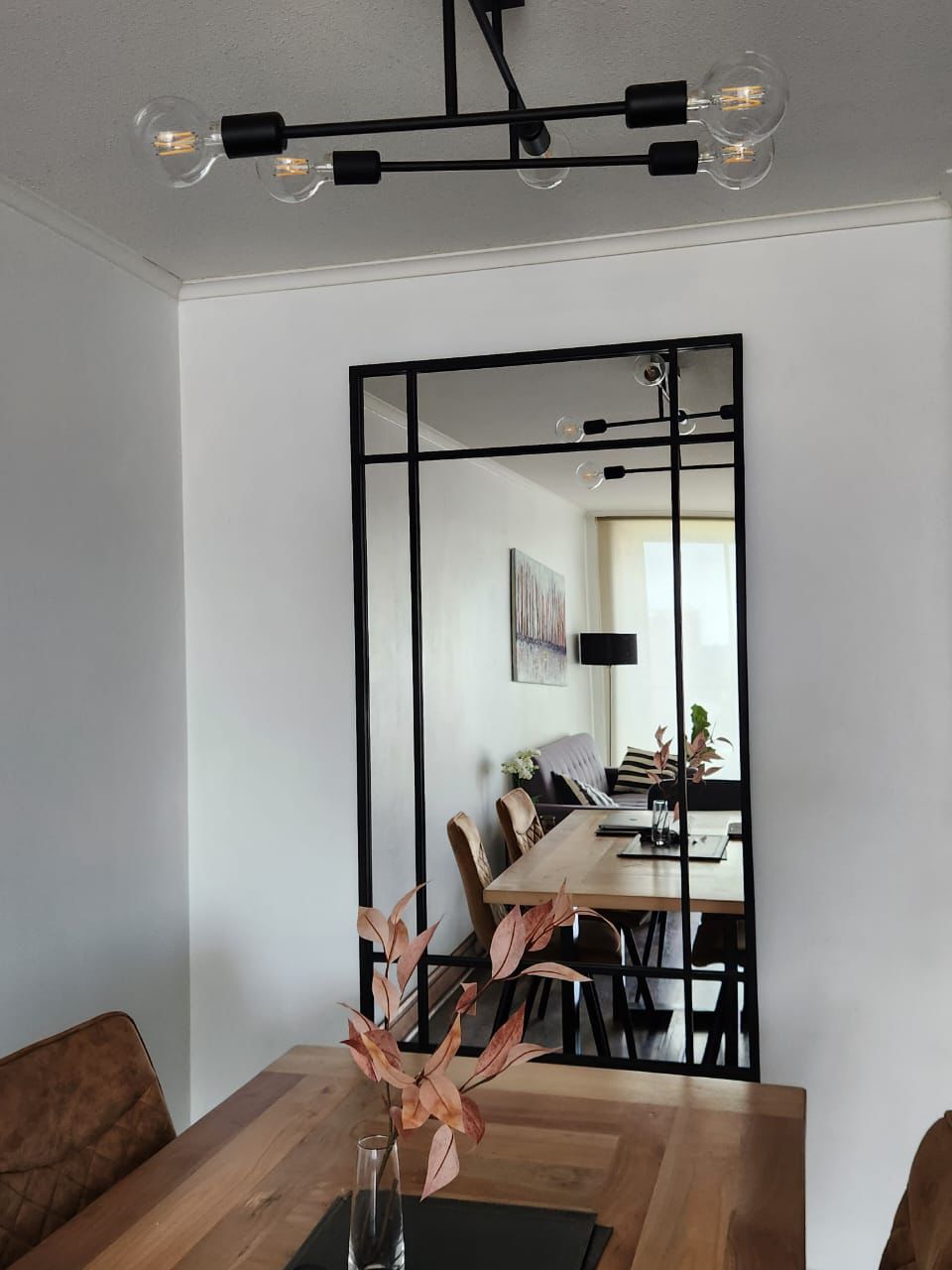 Un espejo moderno con carácter industrial, ideal para darle personalidad y amplitud a cualquier espacio. Su marco negro dividido crea líneas limpias y un efecto visual tipo loft, elevando al tiro la estética de livings, dormitorios, pasillos o estudios.