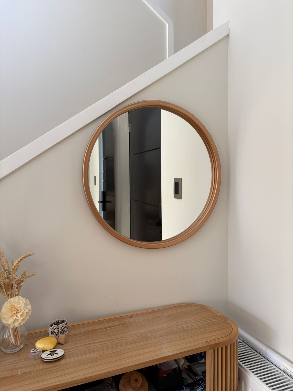 Un clásico moderno que aporta calidez inmediata. Su forma redonda suaviza los espacios y su marco de madera premium entrega un acabado natural, elegante y atemporal. Perfecto para entradas, dormitorios, baños o cualquier pared que necesite luz y diseño sin esfuerzo.