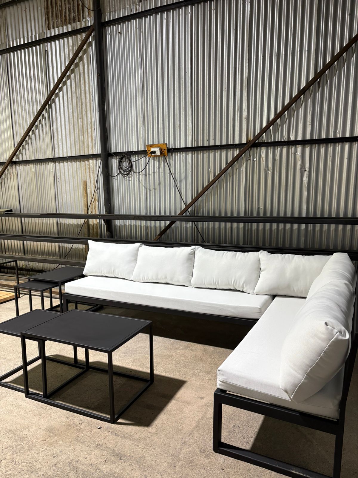 Un juego de terraza moderno y cómodo, diseñado en formato L para aprovechar al máximo el espacio. Su estructura metálica firme, cojinería acolchada y mesas nido incluidas crean un ambiente perfecto para compartir, descansar y disfrutar al aire libre con estilo.