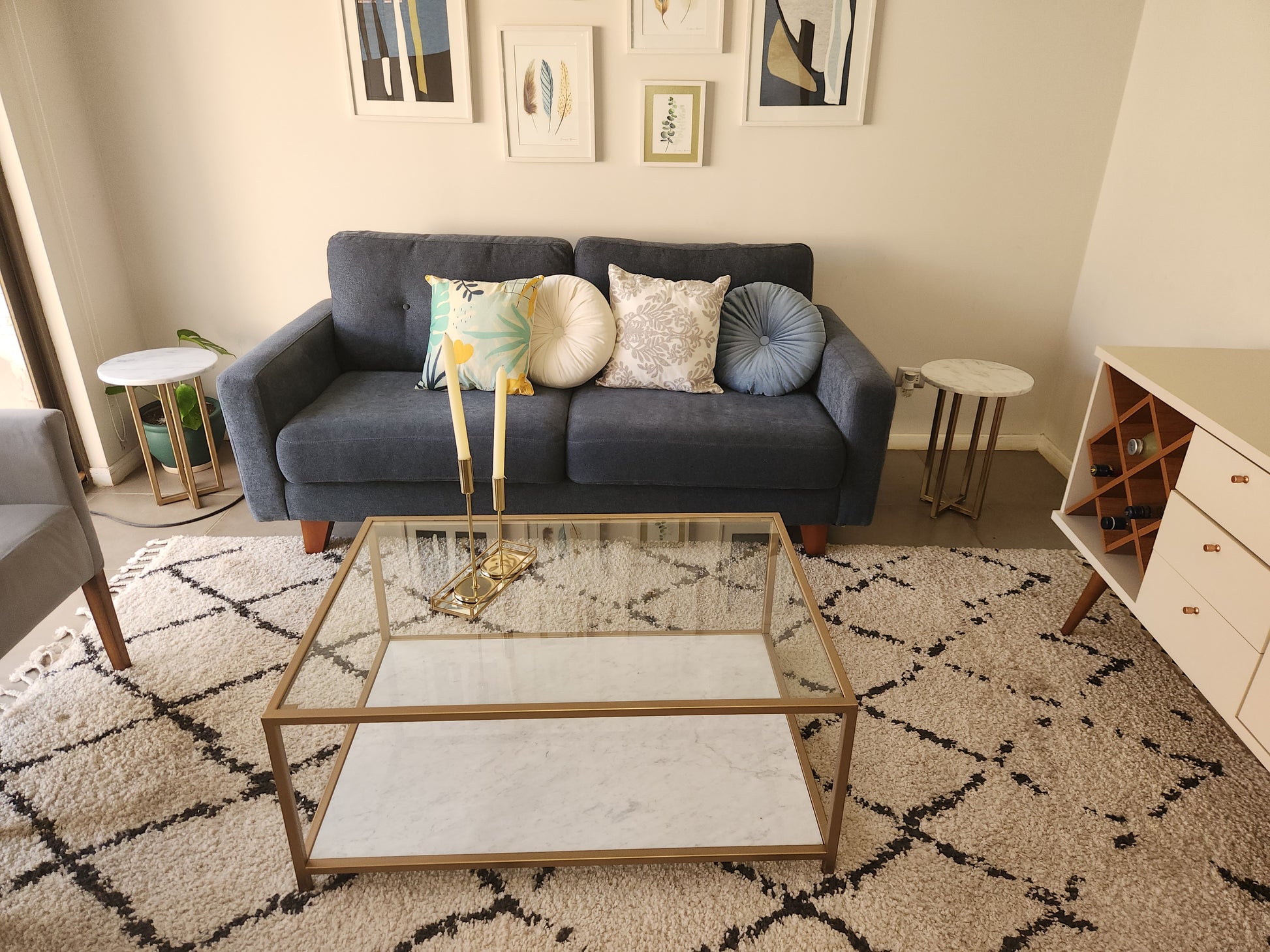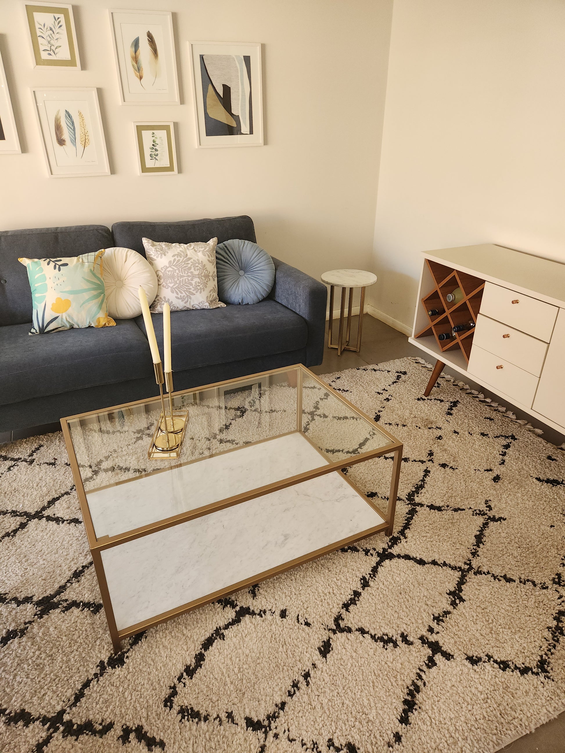 Una mesa de centro elegante y llena de presencia, diseñada para transformar el living en un espacio más moderno y luminoso. La combinación de vidrio y mármol Carrara aporta sofisticación, mientras que la estructura dorada añade un toque cálido y decorativo.