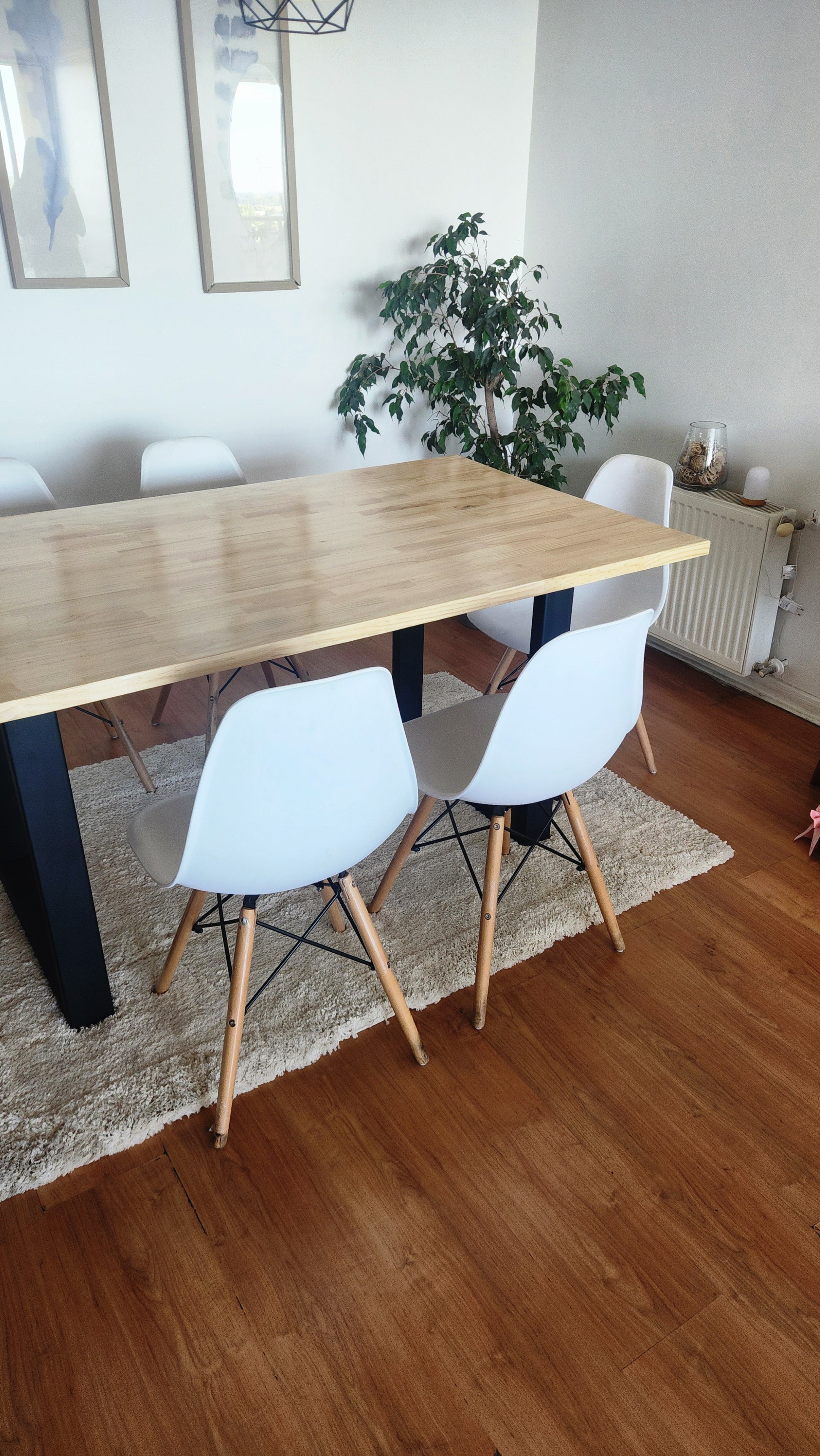 Una mesa moderna y equilibrada, perfecta para espacios donde buscas durabilidad, diseño limpio y un look contemporáneo. Su cubierta de pino finger de 29 mm ofrece una apariencia pareja y luminosa, mientras que el vitrificado natural protege y realza la textura de la madera. La base metálica asegura estabilidad total y un estilo minimalista que combina con cualquier comedor.